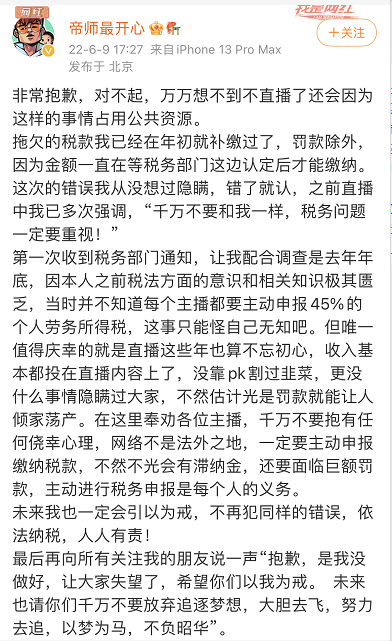 记者发稿前,帝师也在微博回应了偷逃税款一事并表示,“未来我也一定会引以为戒,不再犯同样的错误,依法纳税,人人有责!”
