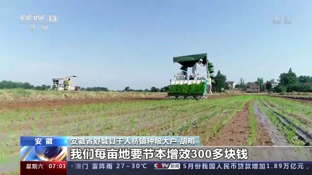 安徽省舒城县千人桥镇种粮大户 胡明:往年我们1000多亩地,要将近一个月才能作业完。今年交给农技托管中心,十天就能做完,每亩地要节本增效300多块钱。