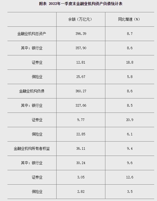 初步统计,2022年一季度末,我国金融业机构总资产为396.39万亿元,同比增长8.7%,其中,银行业机构总资产为357.9万亿元,同比增长8.6%;证券业机构总资产为12.81万亿元,同比增长18.8%;保险业机构总资产为25.67万亿元,同比增长5.8%。