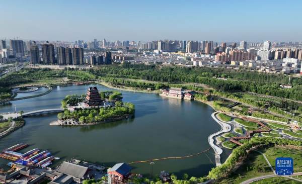 红石峡生态公园榆阳区榆溪河两岸绿树成荫(6月10日摄,无人机照片)。