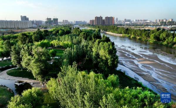环境优美的榆林市榆阳区榆溪河生态长廊(6月10日摄,无人机照片)。