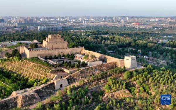 位于榆林市榆阳区城北的镇北台被绿树环绕(6月10日摄,无人机照片)。