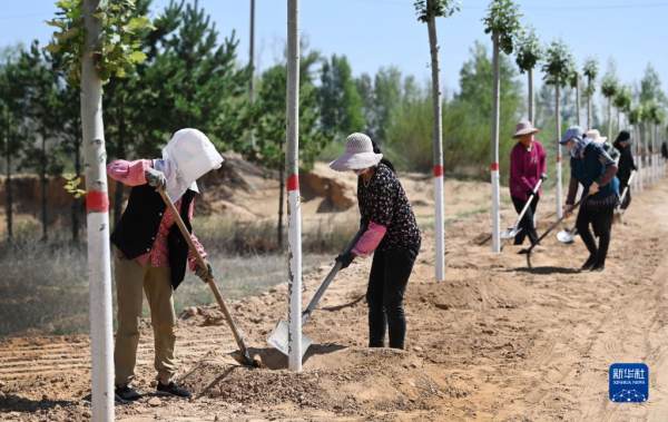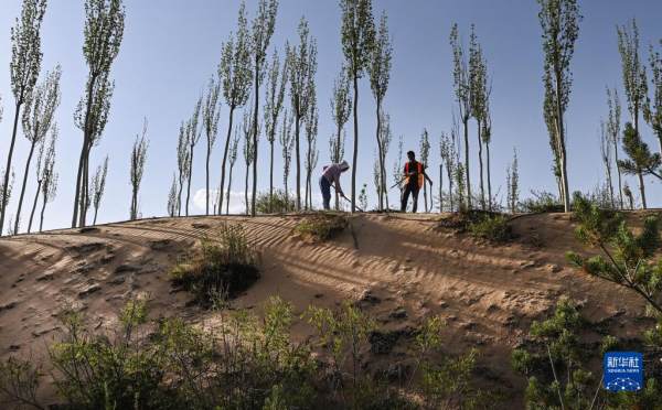 榆林市榆阳区金鸡滩镇白舍牛滩村的村民为新栽的杨树苗打坑围堰(6月10日摄)。