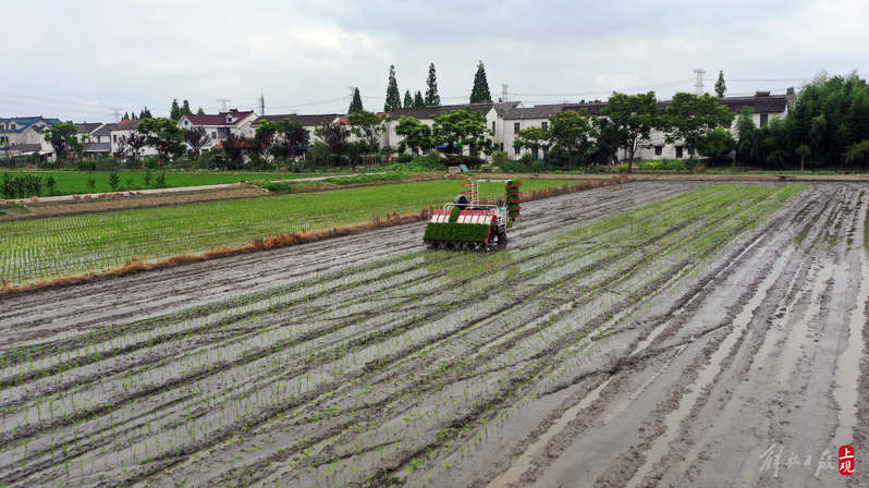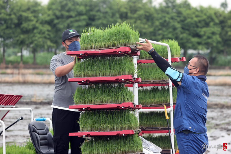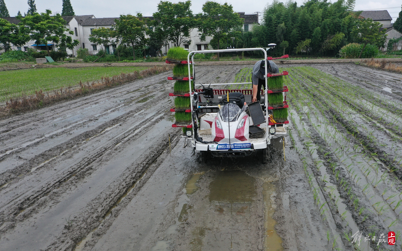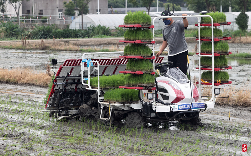 2022年6月21日,无人驾驶插秧机在快速插秧。当日,长三角水稻生产全程机械化科研基地(上海)在青浦区现代农业园区召开项目工作进展交流会。