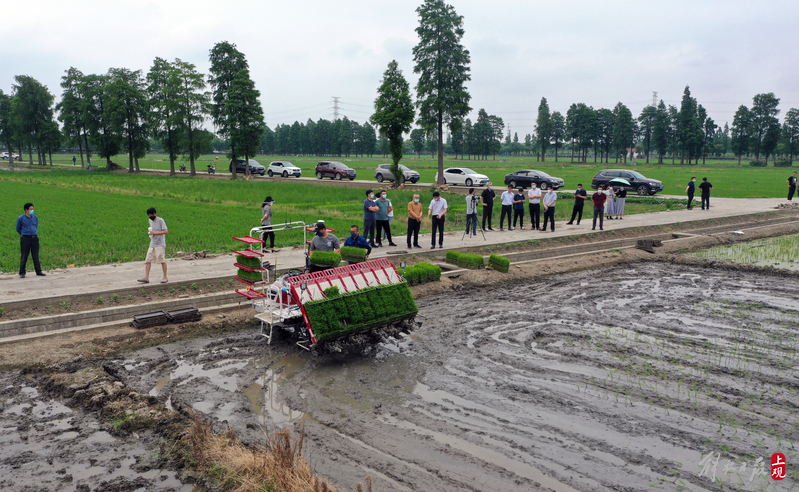 上海市发改委地区处、市农业农村委农机化处、市场信息处等工作人员在田头现场察看了解无人驾驶插秧机的作业情况,听取市农科院课题介绍。