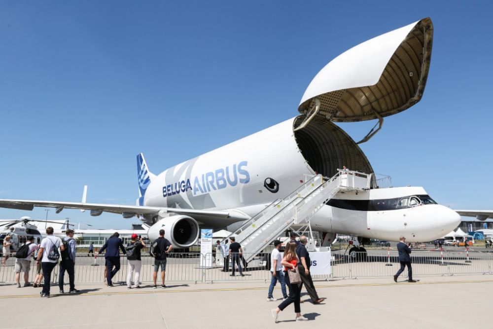 6月22日,在德国首都柏林南郊,人们参观一架展出的空中客车“大白鲸XL”运输机。新华社记者单宇琦摄