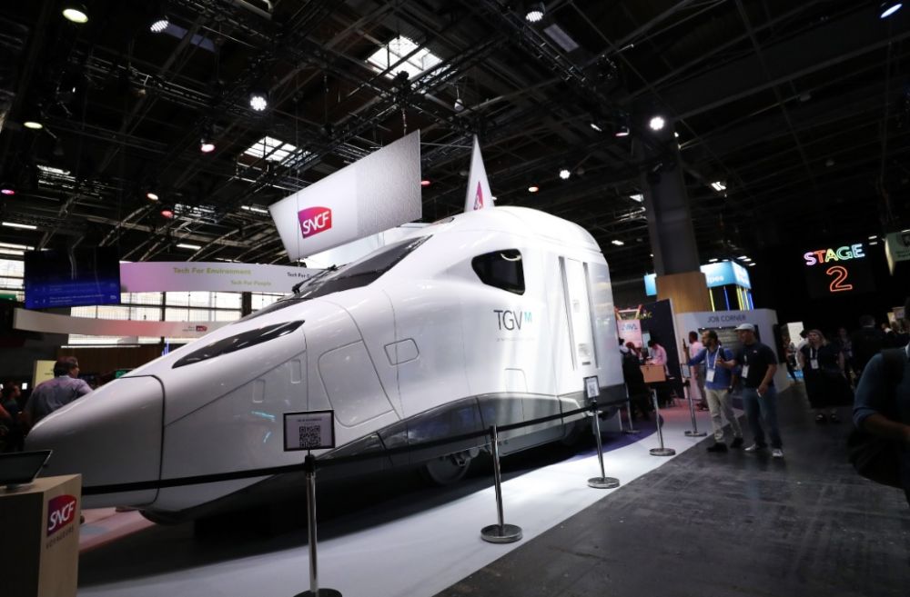 这是6月15日在法国巴黎举行的“科技万岁”科技创新展览会上拍摄的法国国营铁路公司新一代更环保的高速列车TGV M的车头模型。新华社记者高静摄