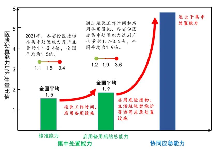 答:近年来,各地逐步提升医废处置能力。新冠肺炎疫情发生以来,各地加快集中处置设施建设,并储备大量协同应急处置设施,我国医废处置能力大幅提升。截至2021年底,全国共有540个医废集中处置单位,集中处置能力达215万吨/年,比疫情前(2019年底)提高39%。总体上,目前各地医废核准常规处置能力与医废产生量的比例,全国平均为1.5倍,其中高于平均数的省份有18个,其他低于平均数的13个省份集中处置能力也都超过产生量;通过延长设施工作时间及启用备用设施等方式,提升后的各地医废处置能力与医废产生量的比例,全国平均为1.9倍,其中高于平均数的省份有19个,其他低于平均数的12个省份,集中处置能力均在其产生量的1.2倍以上。此外,各地还储备了充足的应急处置能力(包括备用设施,以及危废焚烧炉、生活垃圾焚烧炉等协同应急处置设施),可随时启用以保障应急处置。全国医废处置能力总体充足。据测算,每100万人参加核酸检测产生约5吨核酸检测废物,现有医疗废物常规和应急处置能力能够满足包括核酸检测废物在内的医疗废物处置需求。
