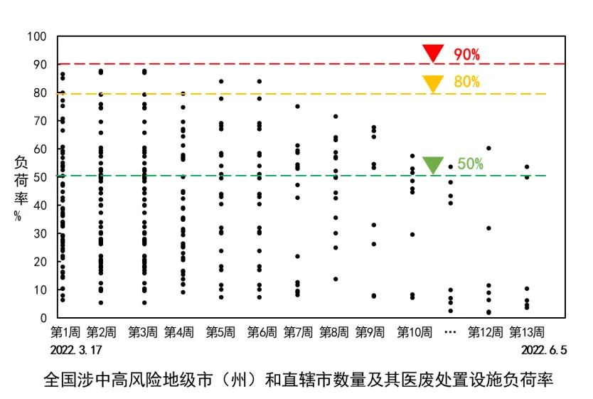 从近期调度情况看,全国中高风险地区医疗废物处置情况平稳有序,近三个月以来,全国涉及中高风险地区的市(州)和直辖市中,医疗废物处置设施日均负荷率均低于90%,其中97%的地区低于80%,66%的地区低于50%。所有医疗废物均得到妥善处置,涉疫医废日产日清。