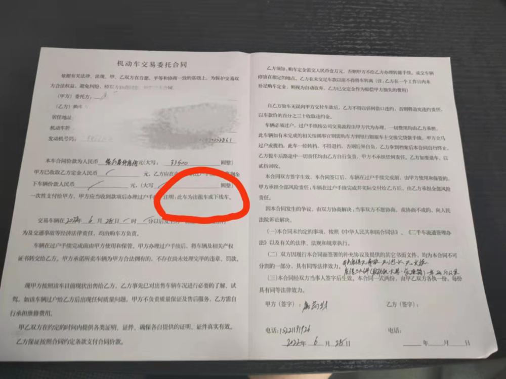 记者仔细阅读这份合同,很快找到了埋下的“坑”:关于过户,合同约定“由乙方验车无误向甲方交付车款后,乙方不得以任何借口违约,否则将追究违约责任,以车款价的30%收取违约金……车辆必须过户……乙方如要退车,以二折回收。”在约定购车款金额的部分,结尾有一句稍不留神就忽略的文字“注明:此车为出租车或下线车”。可见,一旦签下合同,记者买到的就是“出租车或下线车”,而非此前看中的精品车。再联系前一条,若违约或退车,记者将面临巨大的损失。