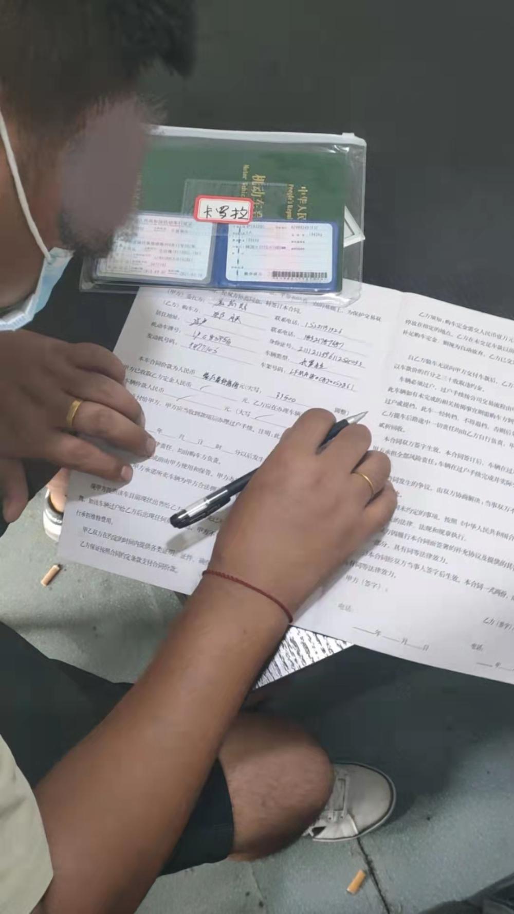 记者答应买车,“星辰”听罢很高兴,带记者进入院子里的一处简易板房签合同。房间里,6个壮汉围坐,有的赤裸着上身,有的文着花臂,嘴里还叼着烟吞云吐雾。“星辰”从书桌抽屉拿出了一份所谓的“制式合同”,除了左上角的买卖双方个人信息和右下角签名处外,合同上无其他可填写之处。为了打消记者的顾虑,他特意在签字区上面写上“甲方质保无事故、无泡水、无火烧,质保三大件(发动机、大梁、变速箱)一年两万公里”。