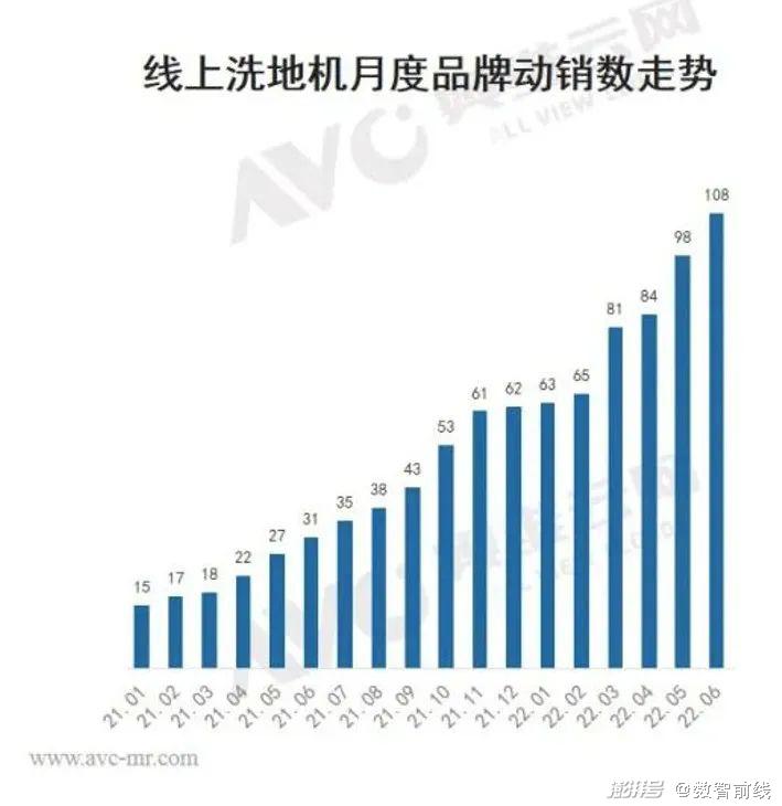 行业的火爆也带来品牌数量持续走高。从2021年1月到2022年6月,短短一年半的时间,洗地机品牌数量飞速上升。线上洗地机月度品牌动销数从2021年1月份的15个,到2022年6月一跃飞升至108个。