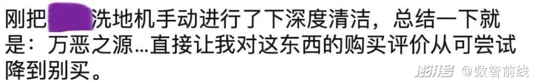 另有用户表示,即便是自动接上下水的洗地机,水箱也不可能完全做到不需清洗。时间长了会产生油腻物,会附着“各种小动物的尸体”。“总之,想偷懒不倒水(或清洗)就是伪命题。”有用户说。