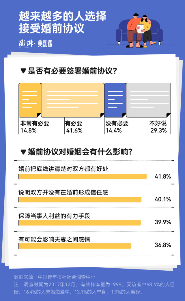 上文提到的中国青年报调查显示:尽管接受婚前协议的人越来越多,但依然有多达 40.1%的受访者认为这表明了双方并没有在婚前形成信任感。