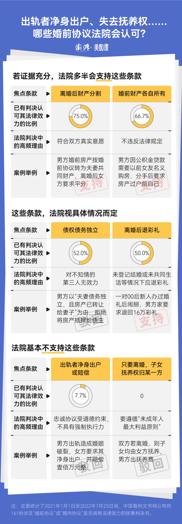 澎湃新闻在梳理涉及婚前协议是否有效的判决书后就发现,《民法典》生效后,极少有法院的判决是认可“忠诚协议”效力的。