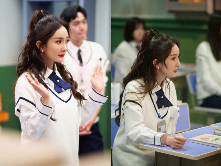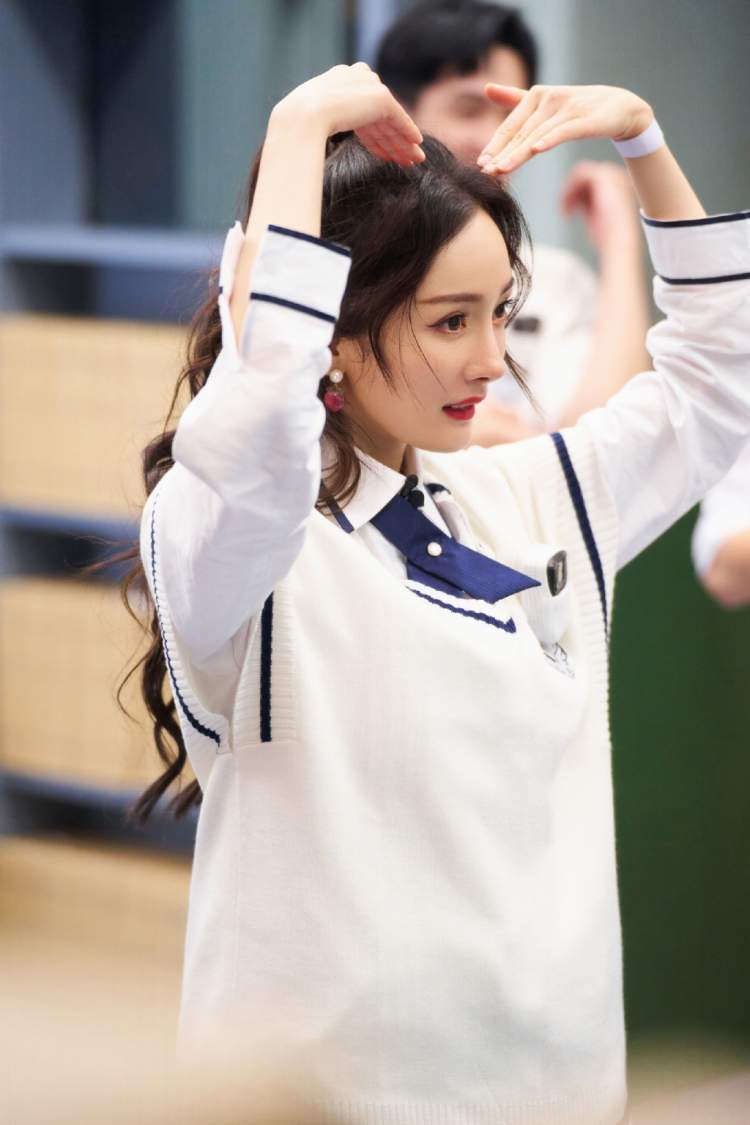 画面中杨幂梳着公主风发型,身上穿着学院风套装,制服外罩着Oversize的背心再加上百褶裙,温柔知性的模样让人忍不住多看几眼。