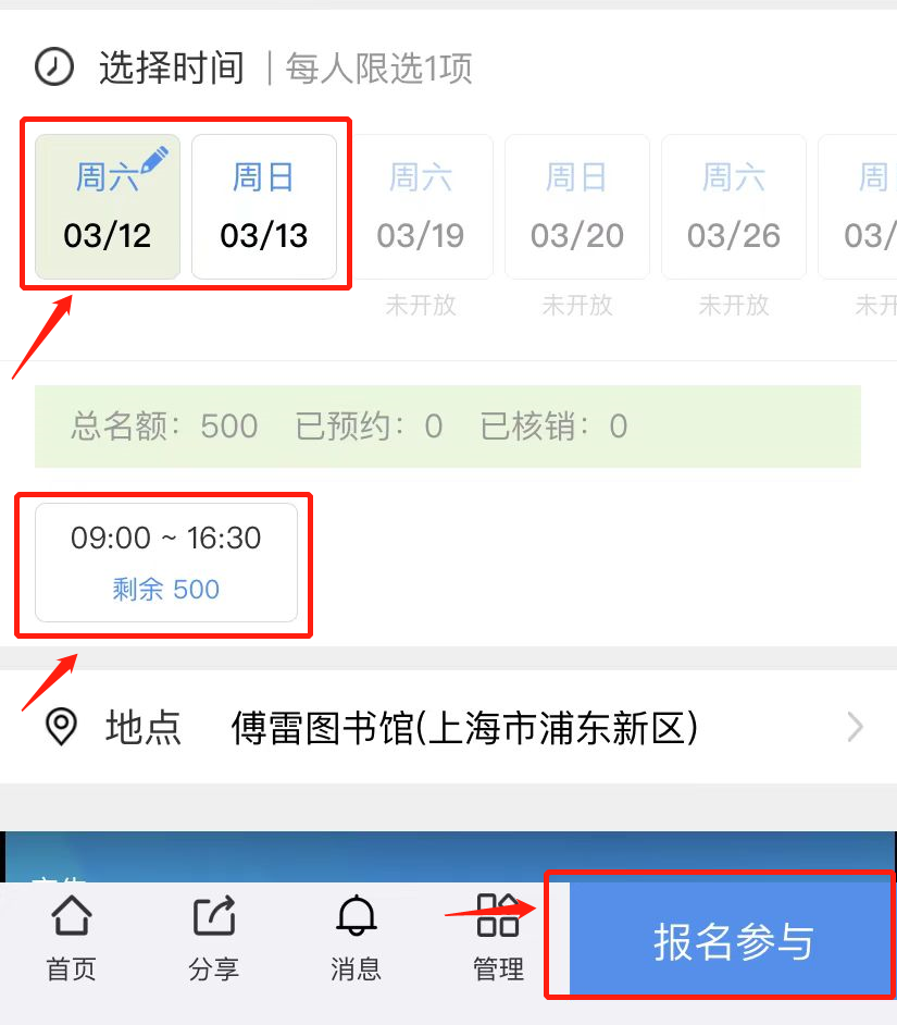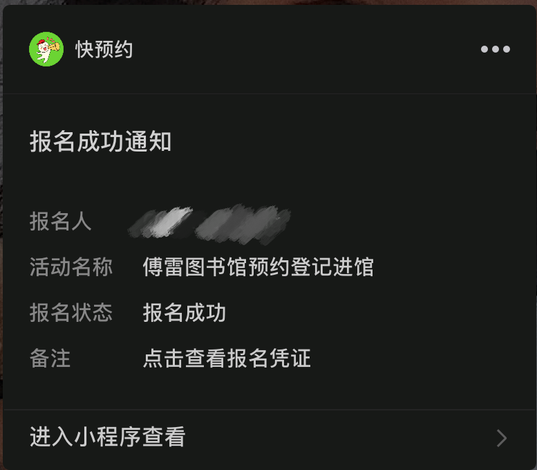 第二步:选择想预约的进馆日期并勾选时间此项,点击确认进行实名制预约,预约成功后,服务通知将推送报名成功通知。