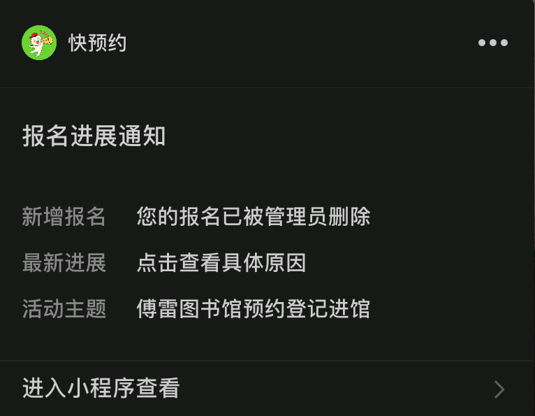 第一步:点击公众号菜单栏【服务】-【预约进馆】-【预约链接】-【微信识别二维码进入小程序查看预约登记详情】;