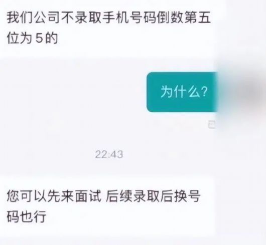4、近日,广东深圳。网传深圳某教育公司招聘员工时,要求手机倒数第五位数字不能为“5”引网友热议。30日,该公司员工回应称此要求是公司老板的要求,并称入职后可以换手机号,如果不同意此要求就不会录用。