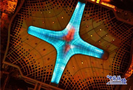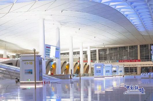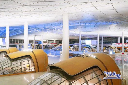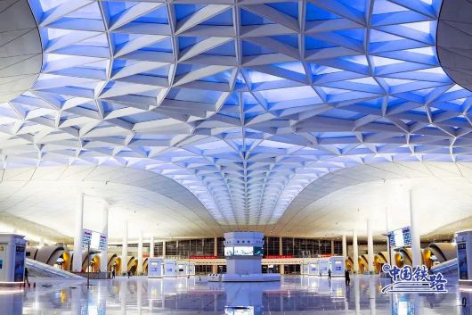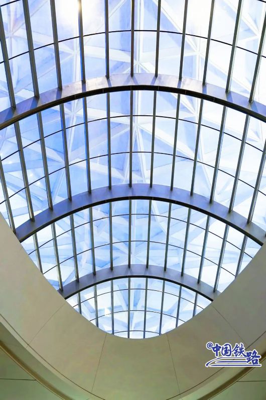 从空中鸟瞰,这座气势恢宏的特大型铁路客站就像一片云朵。巨大的空间以白色为主基调,蓝色天窗宛如一颗“海洋之星”,镶嵌在站房屋顶。