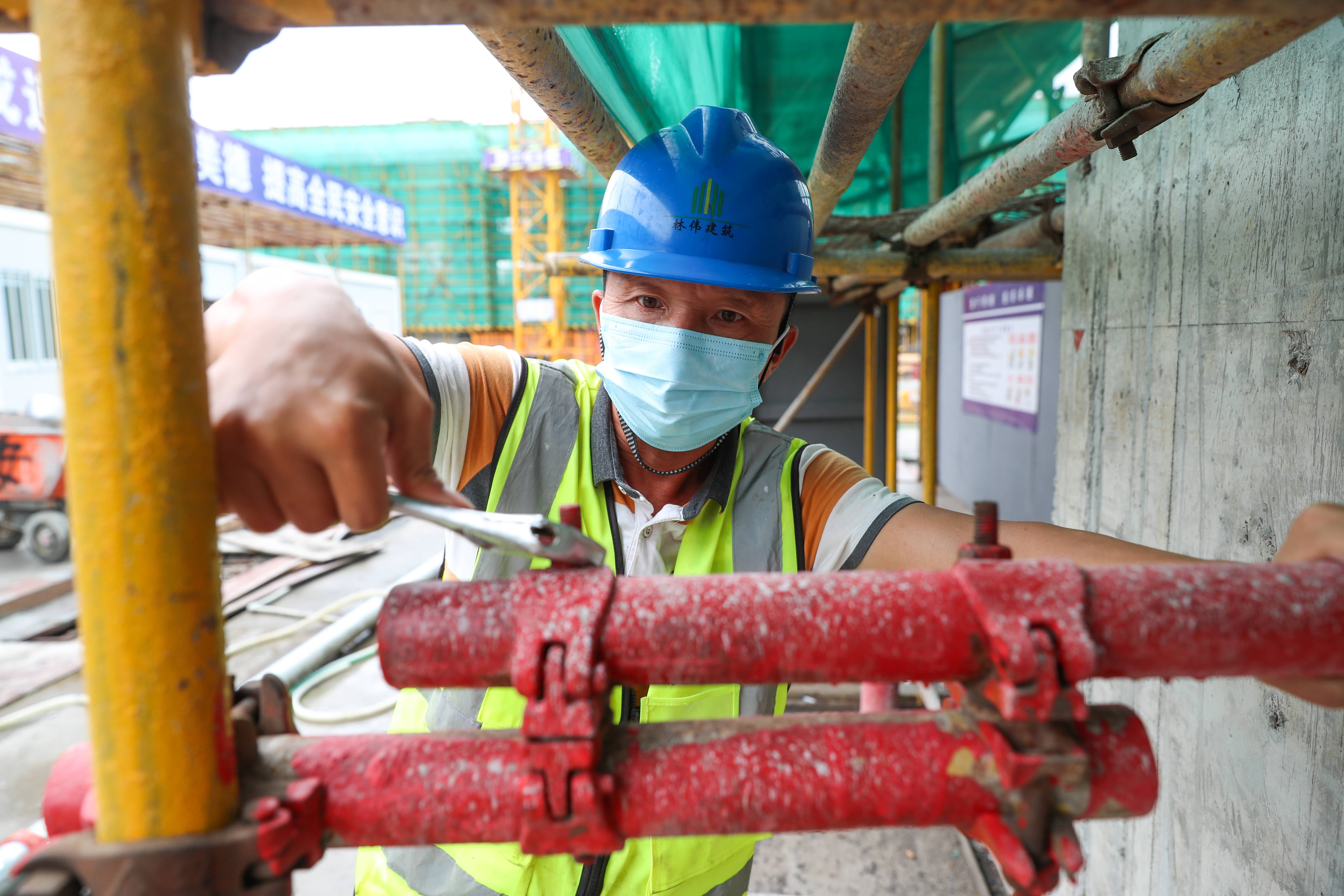 昨天,在小昆山镇四期安置房项 工地,目工人正在检查加固外脚手架,应对即将到来的台风。