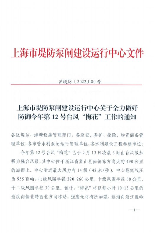 为积极应对台风“梅花”,守护堤防安澜,堤防建设运行中心密切关注“梅花”动向,立足最不利情况,做好充分准备,第一时间制定印发《上海市堤防泵闸建设运行中心关于全力做好防御今年第12号台风“梅花”工作的通知》,要求各部门及相关单位切实加强防汛防台组织领导,切实履行好防汛防台职责,切实做好防强台风的各项准备,以堤防人的实际行动保障设施安全运行。
