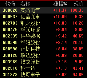 周四盘中,光伏板块快速冲高,截至发稿,英杰电气涨超11%,凯龙股份、亿晶光电、华光环能涨停,科华数据、华阳股份、正帆科技等多股大涨。