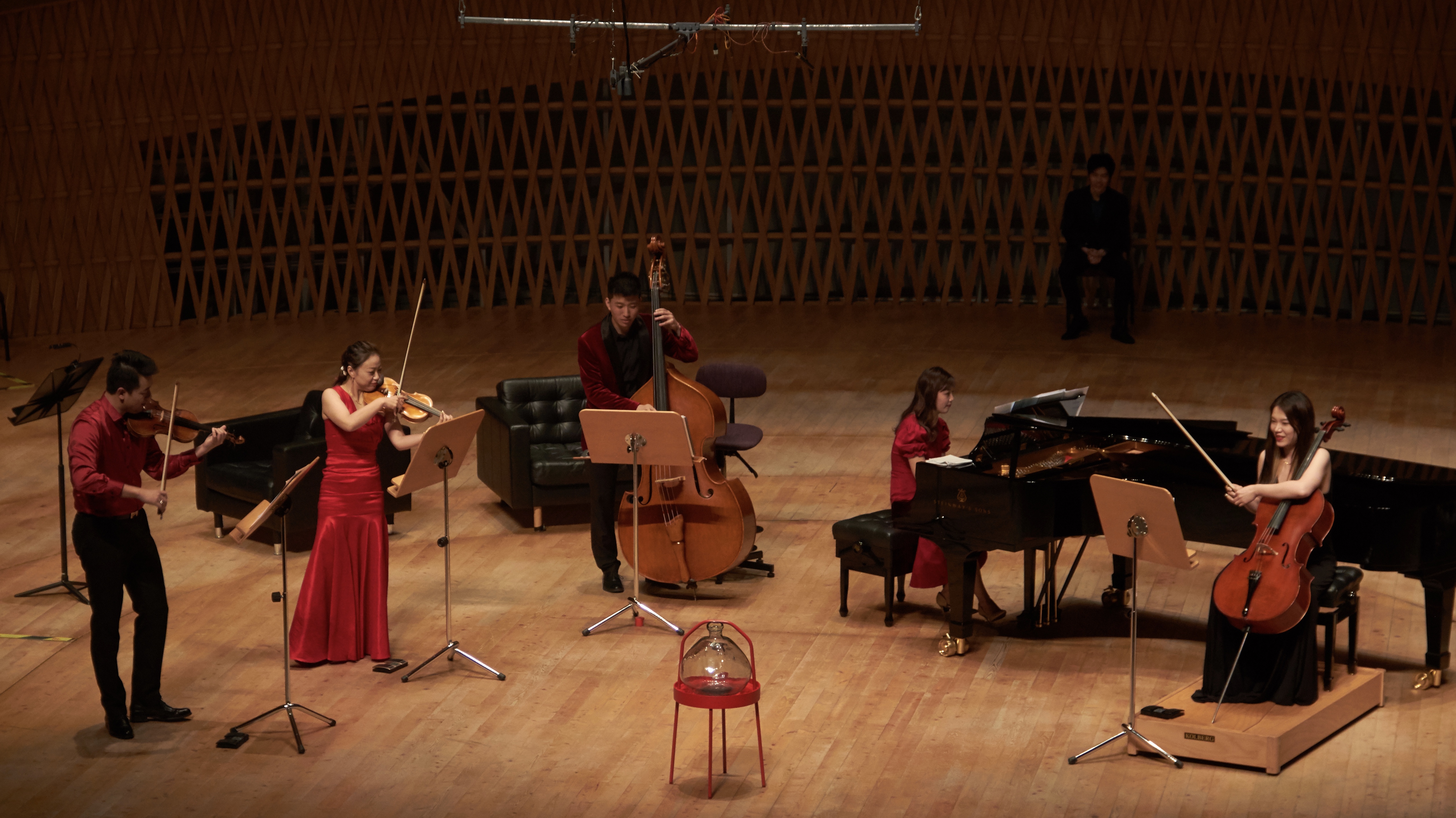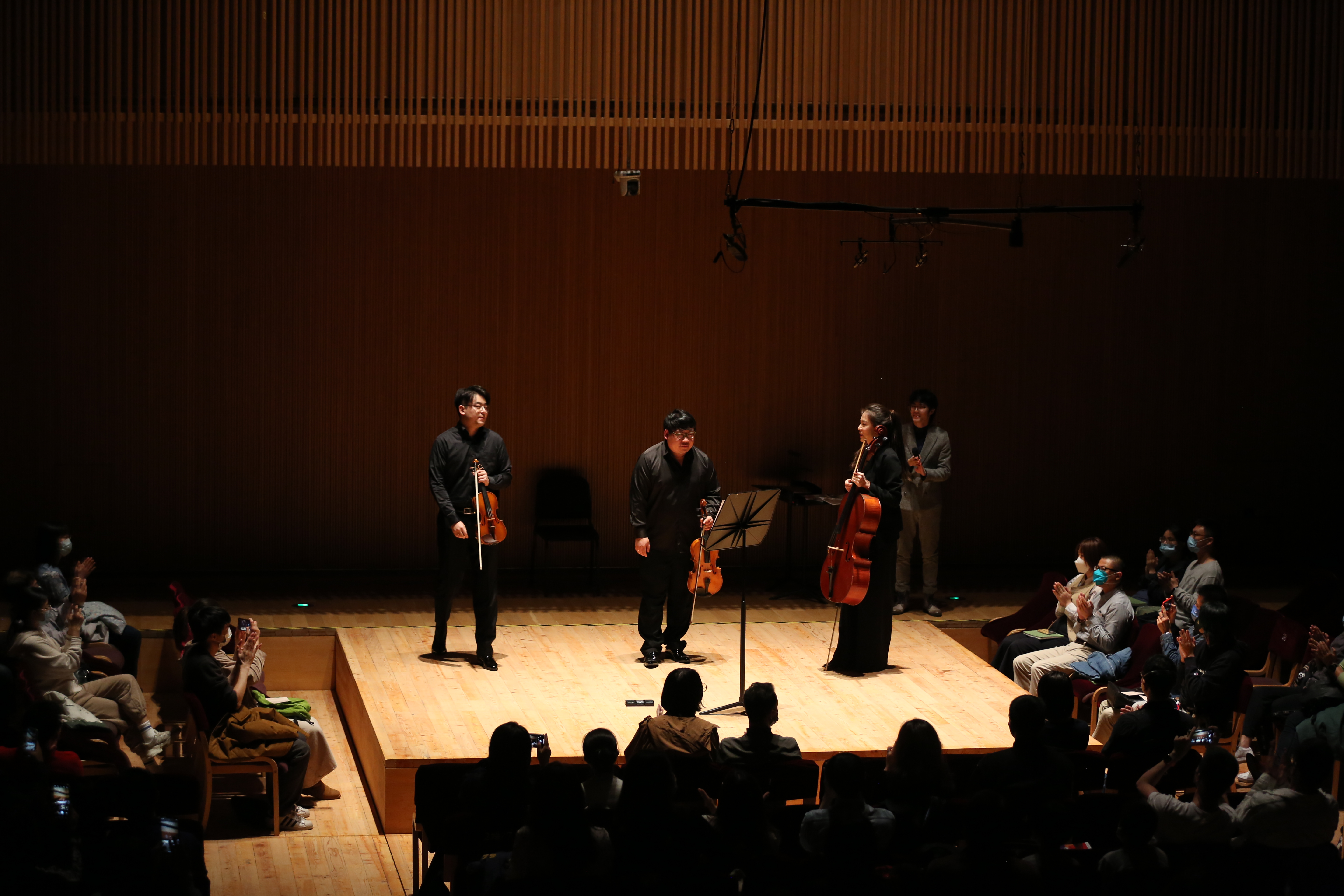“最戏剧性的还属第一场。”大提琴家周润青还记得,那是2019年10月的“准时开场”, 一位迟到观众打断了演奏家的演奏,引发了观众席的骚动和反感。“他屡次站起来找座位,真有观众入戏了,愤怒地喊‘滚出去’。”原来,迟到是这场音乐会特别设置的桥段,迟到观众也是“托”,由低音提琴演奏家张凯旋扮演。