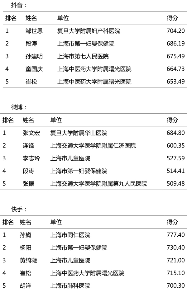 评价结果显示,复旦大学附属中山医院、上海交通大学医学院附属仁济医院、上海市第一妇婴保健院、复旦大学附属华山医院、龙华医院、市第一人民医院、曙光医院、上海市儿童医院、市第十人民医院、市胸科医院、同仁医院、第九人民医院、复旦大学附属肿瘤医院等入选医疗机构健康科普影响力指数排行榜50强;黄浦区打浦桥街道社区卫生服务中心、松江区泗泾镇社区卫生服务中心、奉贤区南桥镇社区卫生服务中心等入选社区卫生服务中心健康科普影响力指数排行榜50强;段涛、崔松、杨阳等入选医务人员健康科普影响力指数排行榜100强。