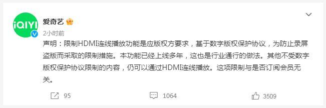 爱奇艺回应“限制HDMI连线播放功能”:应版权方要求,防止录屏