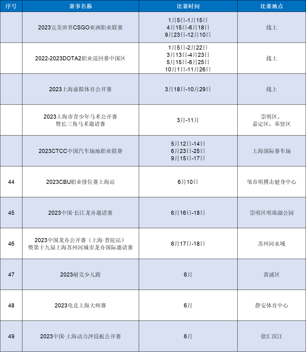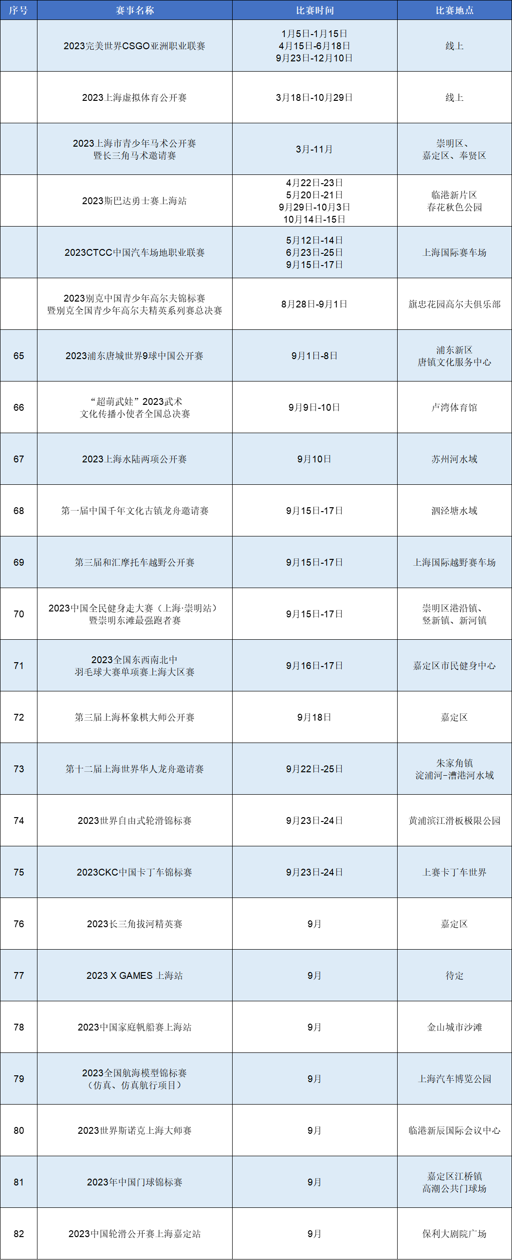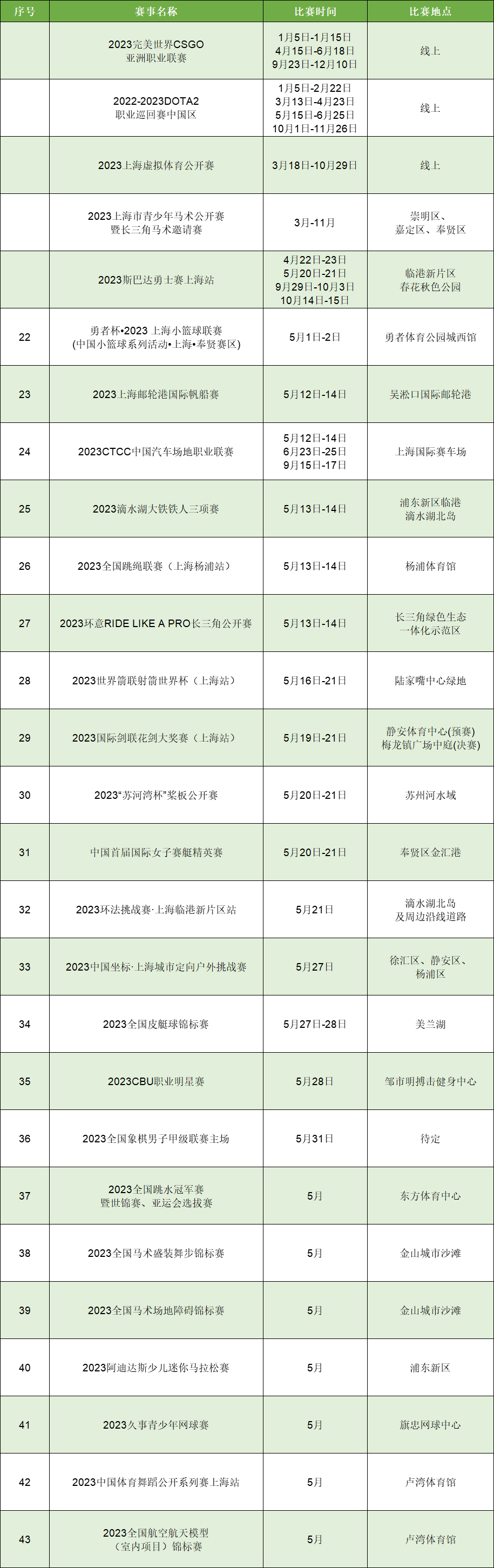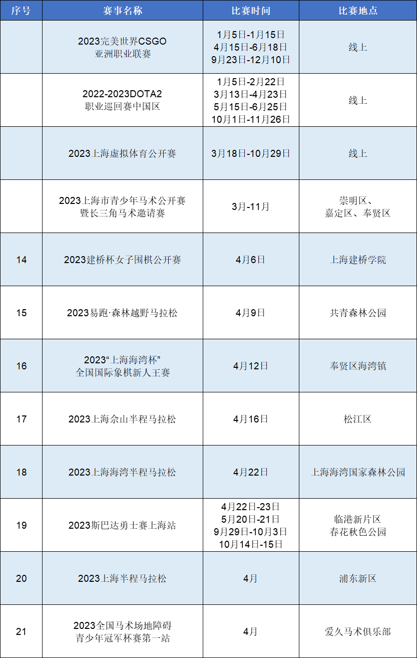 东方网1月17日消息:2023年上海市国际国内体育赛事计划(第一版)近日发布。根据新修订的《体育法》和《体育赛事活动管理办法》等法律法规规章,对国家规定需要审批的赛事,主办方或承办方应完成相关审批手续后方可办赛。足球、篮球、排球等运动项目职业联赛未列入第一版赛事计划,后续将根据国家体育总局相关项目管理中心及运动协会发布的信息,动态调整赛事计划。