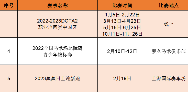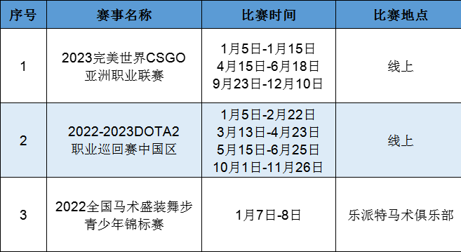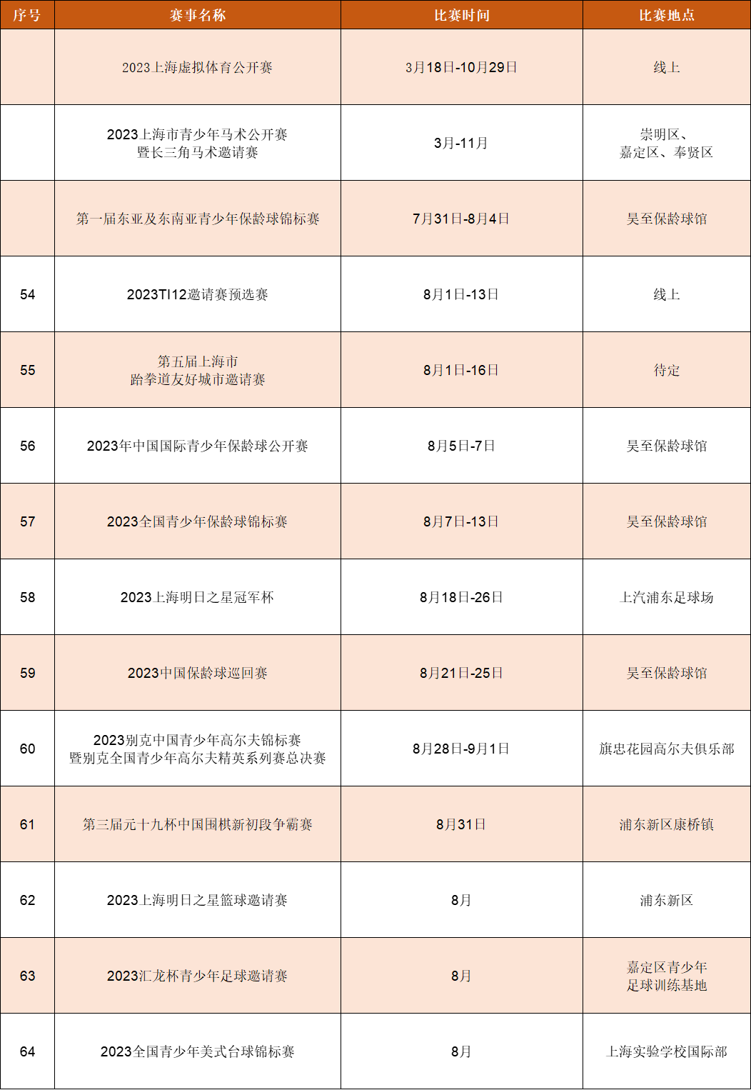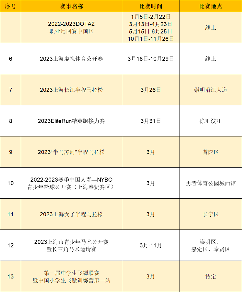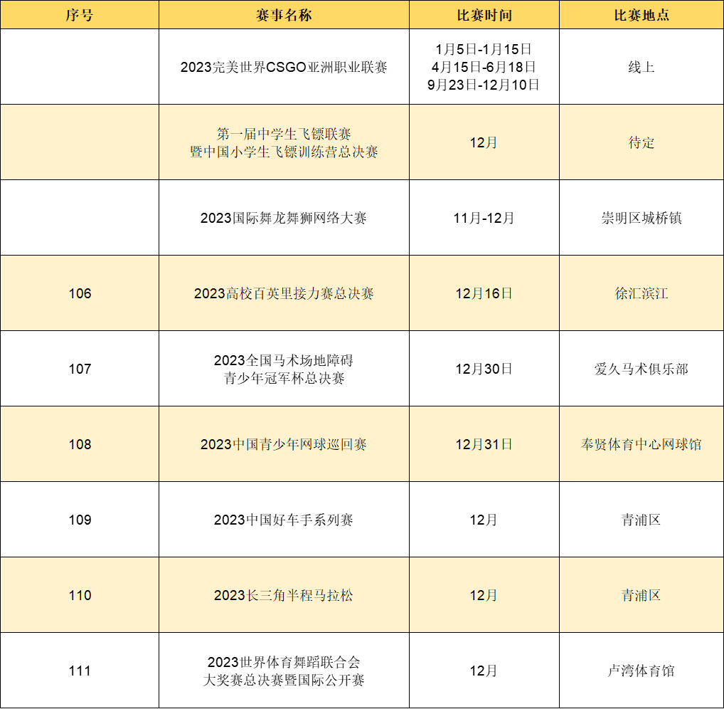 东方网1月17日消息:2023年上海市国际国内体育赛事计划(第一版)近日发布。根据新修订的《体育法》和《体育赛事活动管理办法》等法律法规规章,对国家规定需要审批的赛事,主办方或承办方应完成相关审批手续后方可办赛。足球、篮球、排球等运动项目职业联赛未列入第一版赛事计划,后续将根据国家体育总局相关项目管理中心及运动协会发布的信息,动态调整赛事计划。