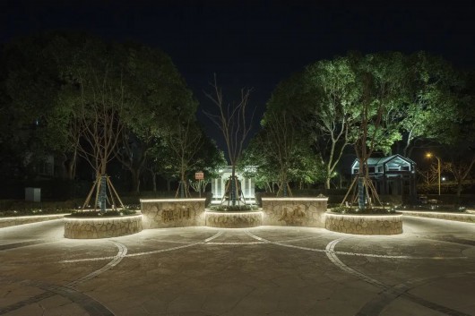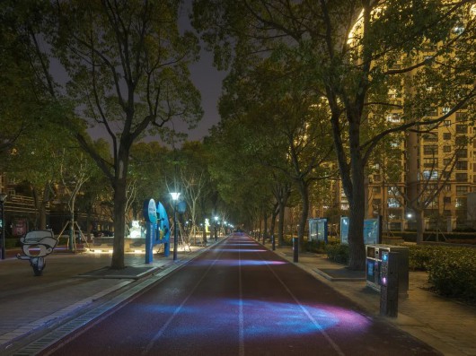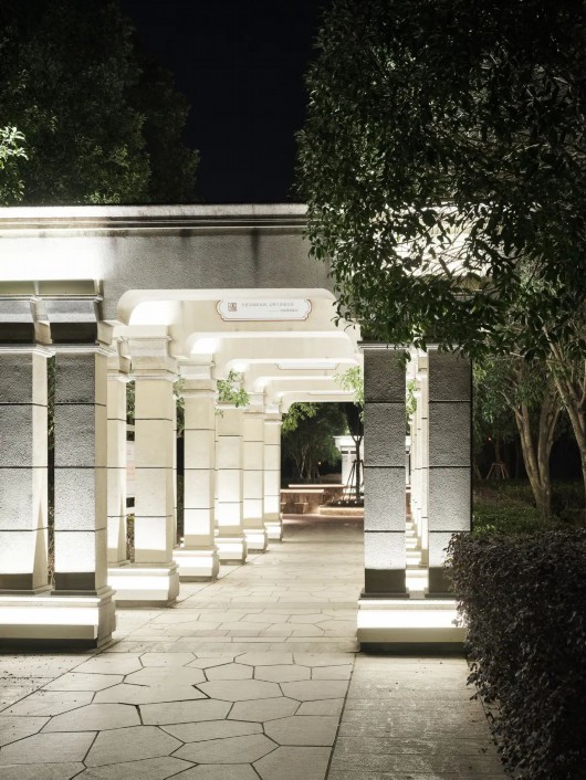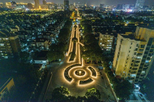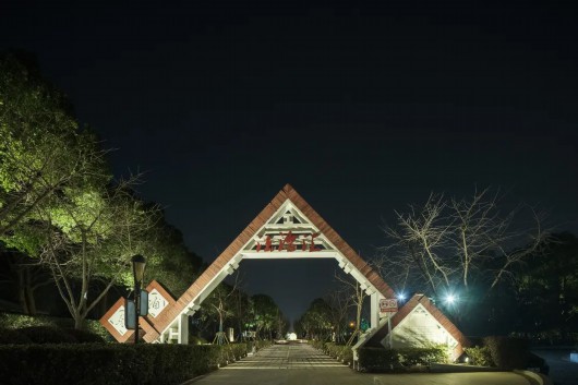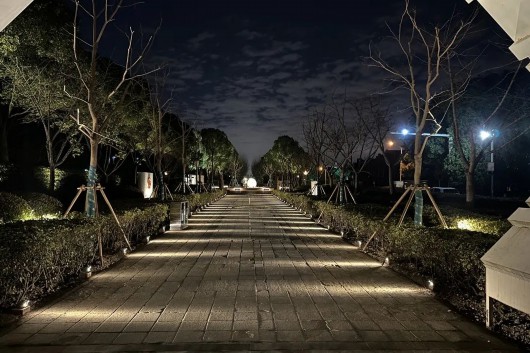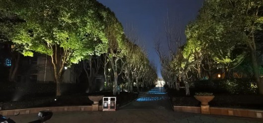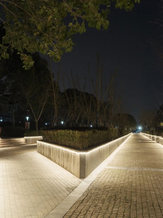 每个黄昏褪尽的夜晚,韩谊路的灯光便自然地融入到了景观之中。淡淡的灯光轻柔地洒在了走道上,应和着天空中微弱的月光,不仅赋满诗意,也给住宅区的居民提供了安静温和的游园环境。