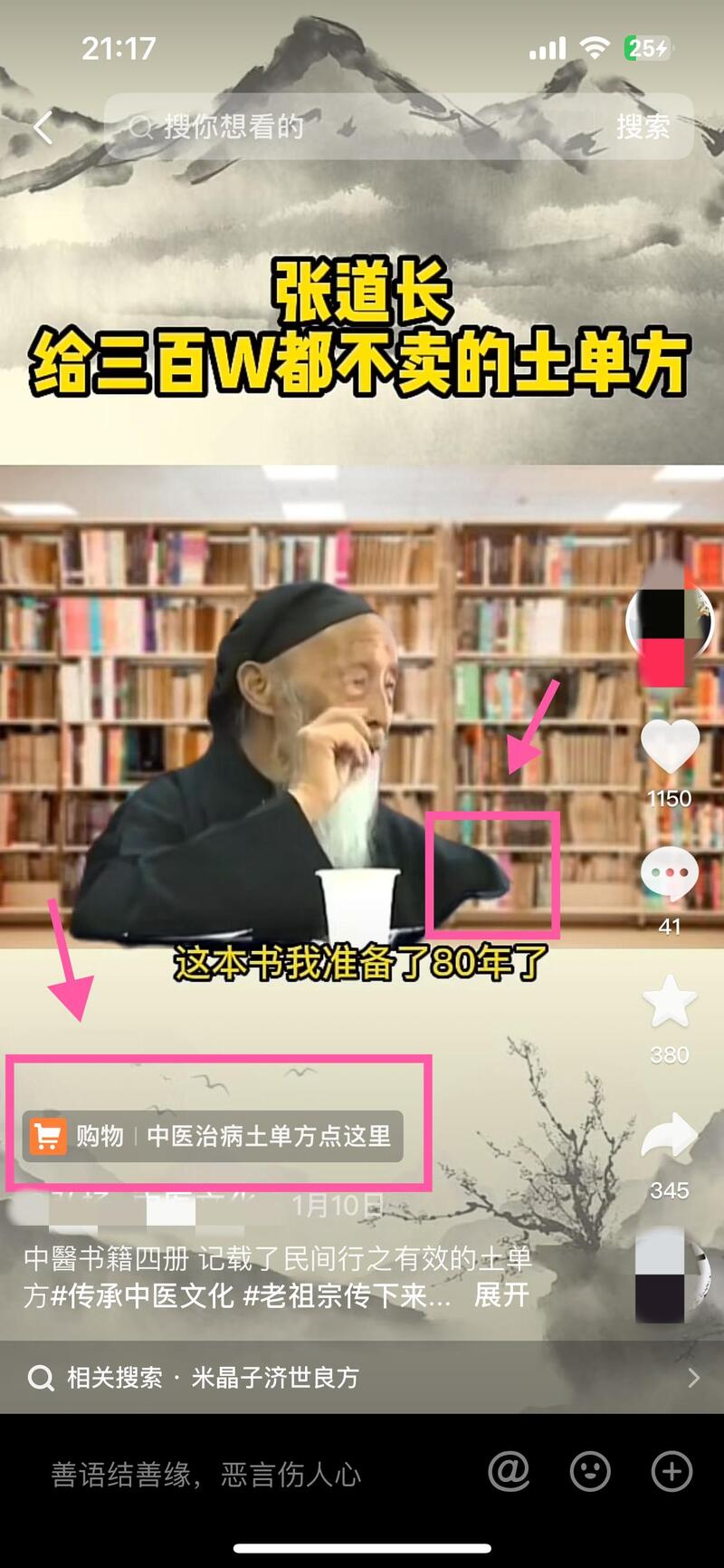 例如,有多个号推销“张道士土单方”等“养生书籍”。根据这些视频介绍,相关土单方是“张道士”准备80年的结果,有人出价300万元,张道士都不卖,但现在十几元就能买到一本“土单方大全”。