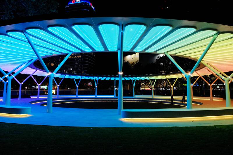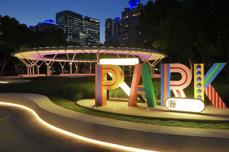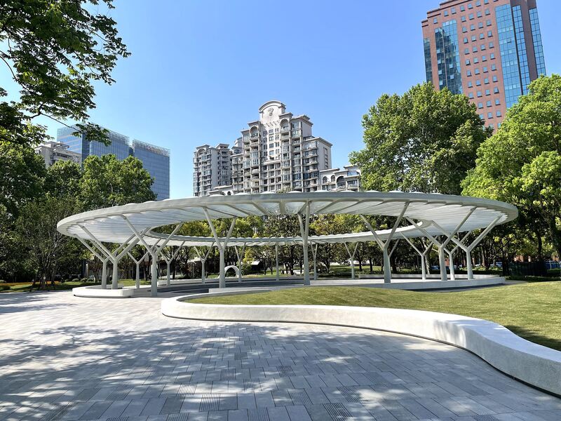 从仙霞路遵义路大门走进虹桥公园,映入眼帘的是色彩活泼的英文“PARK”(公园)字样及其身后一座白色、简约的圆形回廊,而这也是公园全新打造的视觉亮点和功能焦点“虹桥源亭”。据悉,这座直径36米的圆形廊架特别选用了ETFE膜材,具有自重轻、绝缘、耐磨等特点,表面光滑不易附着灰尘,每个独立气囊均可被变色的LED点亮,营造出“水立方”同款的光影变幻效果。廊架下方还设置了弧形座椅、下沉式台阶等颇具“剧场感”的装置设计,400平方米的活动空间内可举办公益演出、小型音乐节、发布会、购物集市等各类活动。