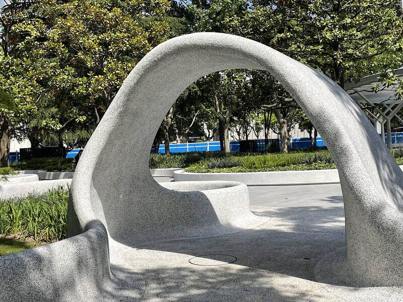 而今,这些“问需于民、问计于民”金点子都反馈在了公园全新的面貌中。在公园北侧,一处水洗石打磨而成的“S”形地景艺术颇为吸睛。但仔细观察能发现,这处可坐、可站、可躺的装置巧妙地绕开了五棵高大的香樟树。王晔菲介绍,虽然虹桥公园的人流动线、健身步道和视觉效果都“大变样”,但年代久远的树木都保持了原位,通过增设“云朵花园”等园艺小品增添趣味。一处形如拱门的白色通道则是专门为小朋友们所设,延续30多年前儿童交通公园的历史印迹。