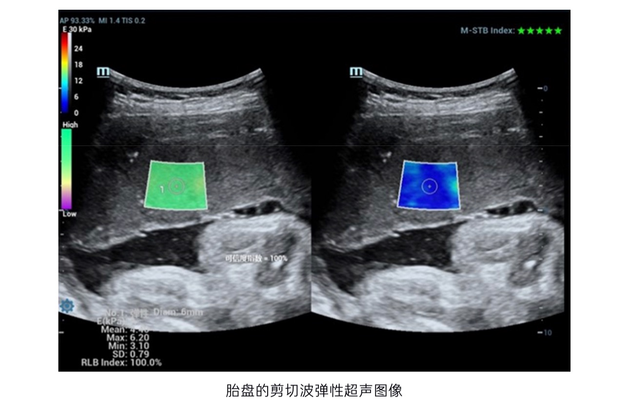 超声弹性成像技术是近年来热门超声技术。从早期的应变式到现在的剪切波,弹性成像技术的革新为精准化超声评估提供了重要的辅助作用。如果我们在身上摸到一个包块,我们会去压一压它,感受一下这个包块的软硬度。弹性超声就是将这样一个过程和结果给直观的呈现出来。早期的应变式弹性成像,就是通过超声医生手持超声探头规律地对病灶及周围组织进行按压,从而获取病灶及组织的硬度,然而这项技术有个无法回避的缺点,它无法对组织硬度进行量化评估,仅能做半定量对比或者定性分析。近些年来发展出的剪切波弹性技术,已经不再需要医生进行主动地对病灶加压,通过不同的发射激励,使得剪切波在相应组织区域内传播,再将这一信息接收返回处理,从而形成可视化的图像与可被读取、量化的数据。该技术开创性地量化组织硬度,操作方便,安全可靠、可重复性好,已被应用在肝脏、乳腺、甲状腺等组织疾病诊断中,尤其是在无创诊断肝纤维化中具有重要作用。近年来,已经有越来越多的学者将其应用在胎盘检测中。多项研究表明,妊娠期高血压、妊娠期糖尿病的孕妇的胎盘硬度要显著高于正常孕妇的胎盘。