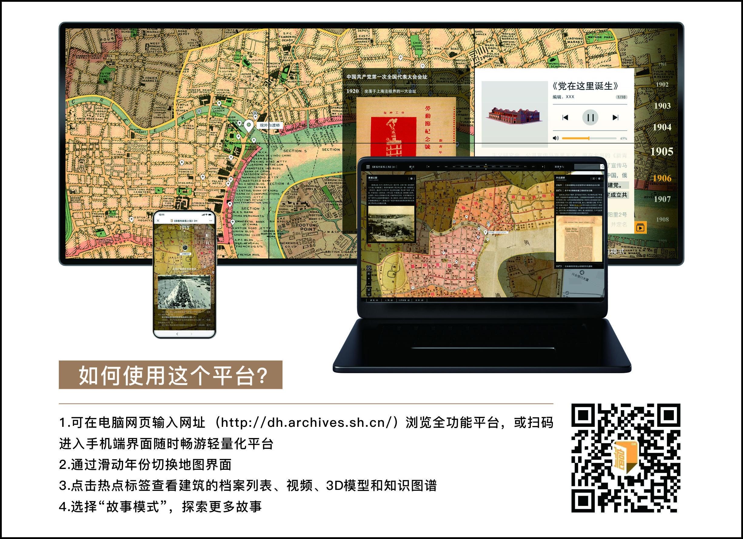 市民可以通过两个渠道进入平台:一个是直接在浏览器输入“跟着档案观上海”数字人文平台网址(https://dh.archives.sh.cn/)进入页面,或扫码进入手机端界面;另一个是通过上观新闻App或网站(https://www.shobserver.com/staticsg/home)入口打开平台,收获更多数字档案文化体验。