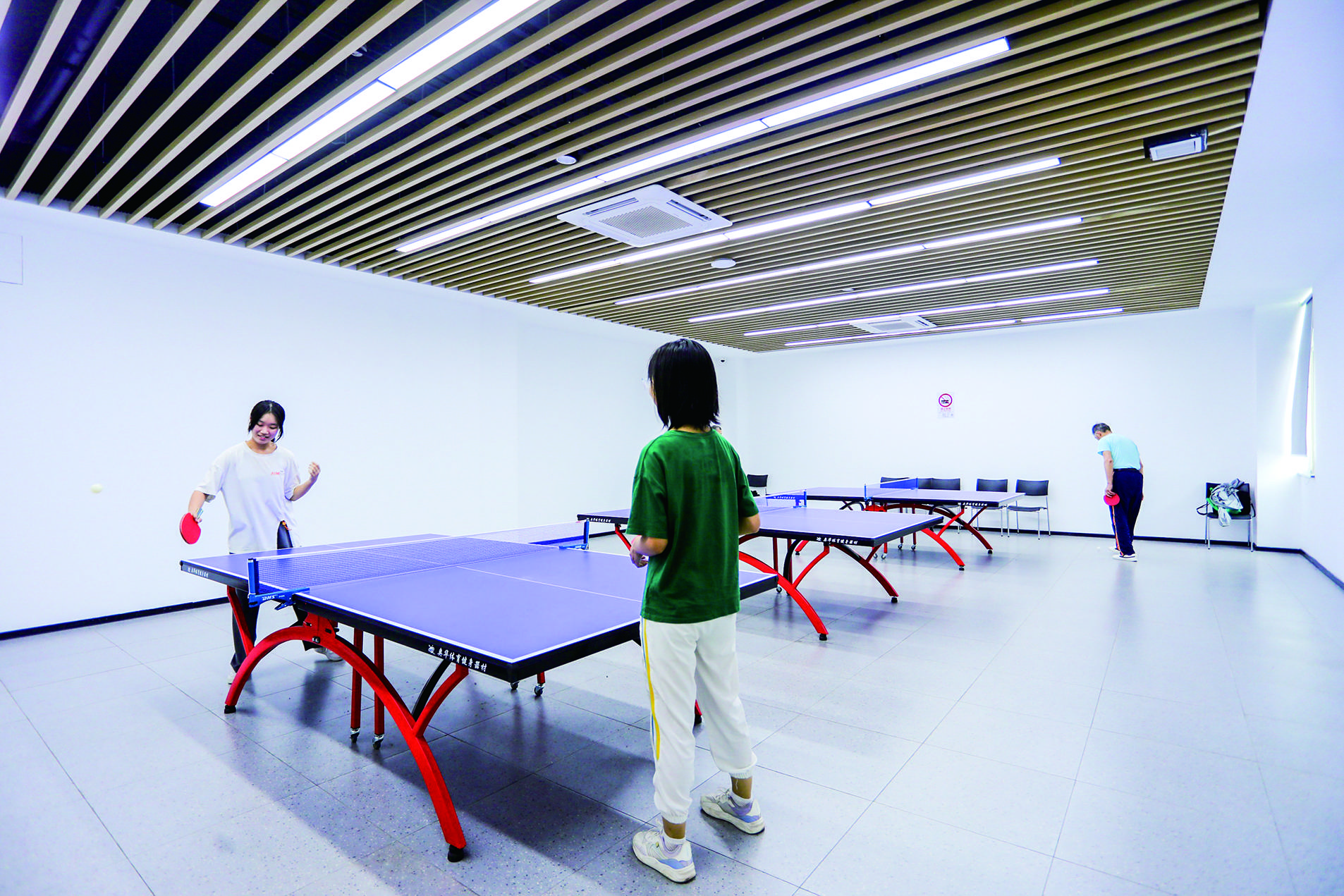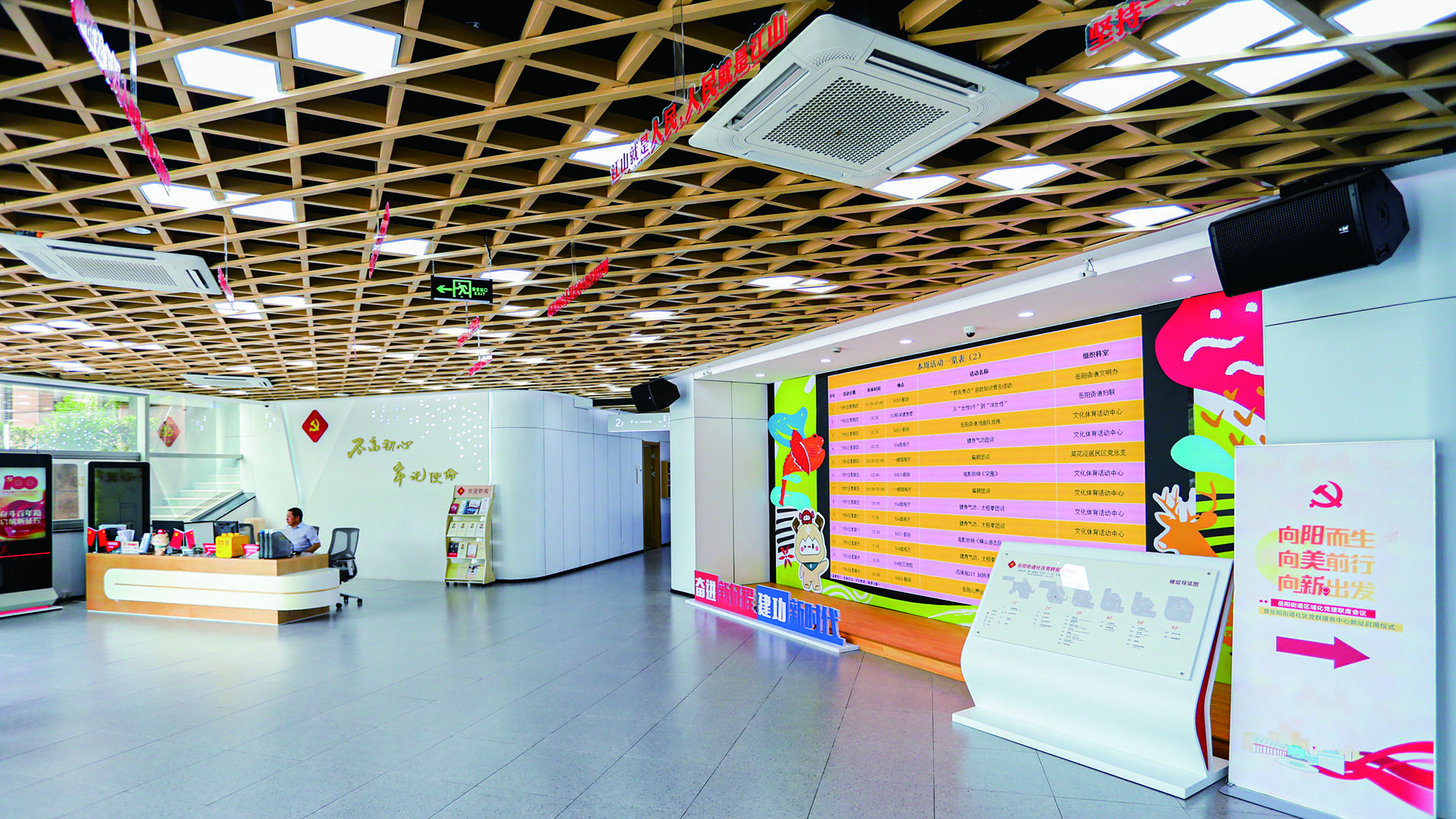 将原本仅400平方米的党群服务空间扩至4100平方米,新启用的岳阳街道社区党群服务中心共有六层,一层是健身休闲区,二层是便民服务区,三层是思政教育区,五层、六层分别是阅读空间和剧场,每层功能特色凸显,实现了多样化服务一站式融通。