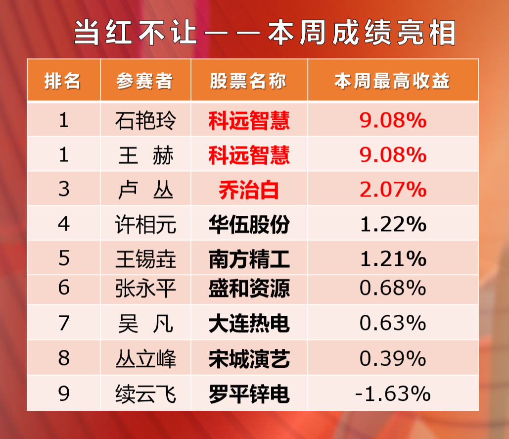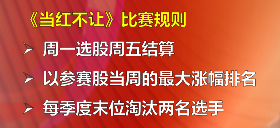 《当红不让》这是我们节目推出的一档虚拟炒股比赛,目的是为观众展示实战高手的选股能力,传授夺冠“一招鲜”。我们的比赛规则是周一选股周五结算,以参赛股当周的最大涨幅排名,每季度会末位淘汰两名选手。