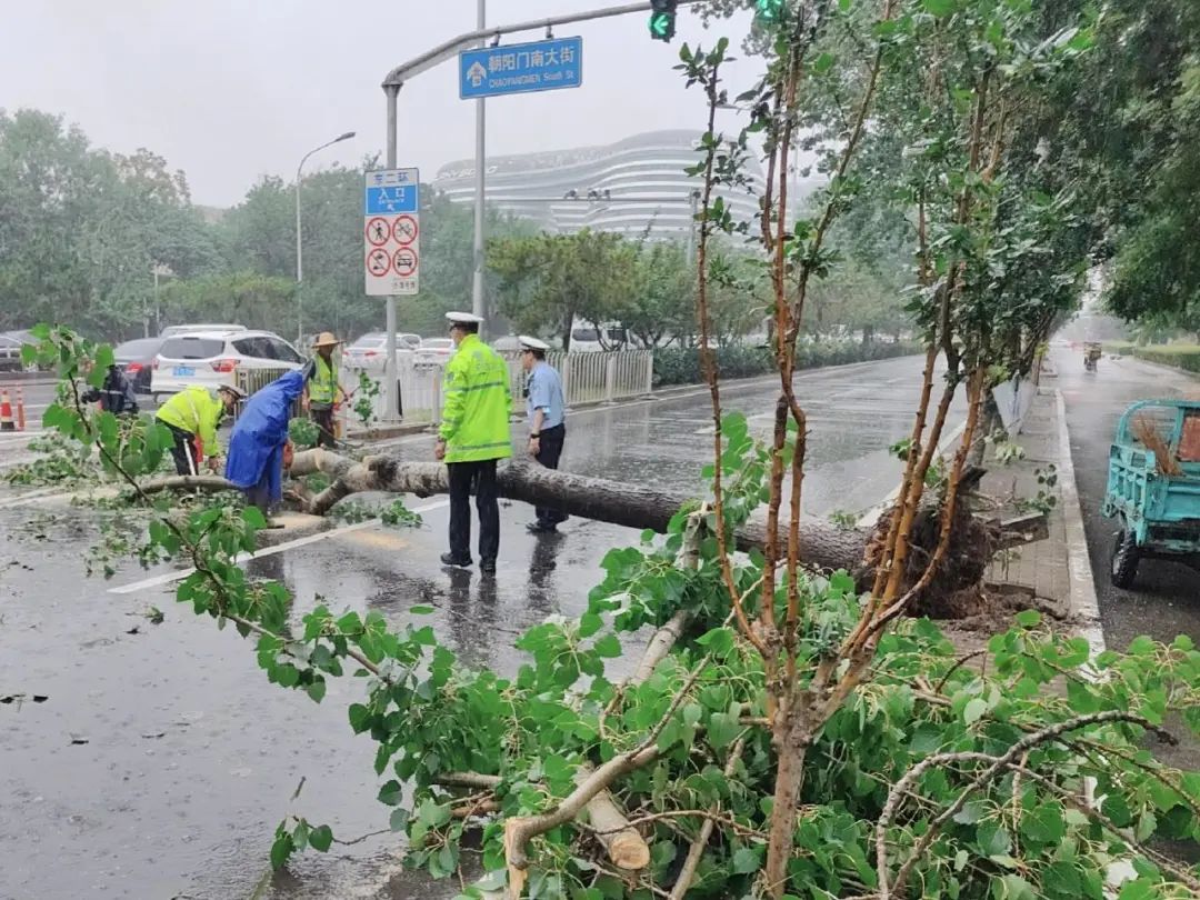 据了解,树倒是由于强降雨天气,加上虫害和树木老化等原因造成。朝阳区园林绿化局绿化一大队工作人员表示,后续这个树还将补植,要将树根清走,路还得修。