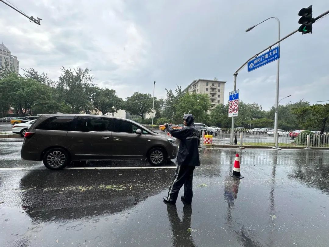 交警迅速利用车中的防汛应急设备进行处置,东单交通大队同步对近端和远端交通节点都立即采取了临时交通管理措施。
