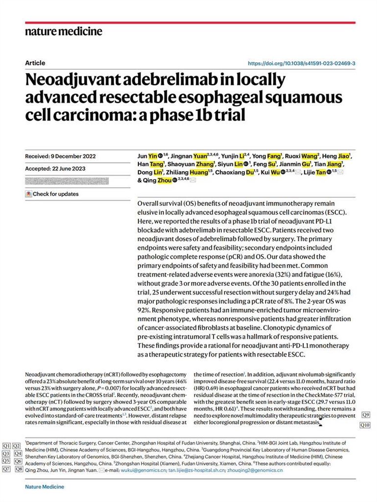 近日,复旦大学附属中山医院胸外科谭黎杰、尹俊教授团队联合华大基因在国际顶级学术期刊《Nature Medicine》(2022 影响因子JIF=82.9)发表研究成果——采用PD - L1抗体免疫新辅助治疗联合手术有望提高局部晚期食管癌晚期患者的治疗效果,并首次揭示了免疫治疗敏感人群的生物学特征。为我国食管癌治疗开辟了新的途径,为广大食管癌晚期患者提供了新的治疗方案,能够有效改善患者生活质量,点燃了新希望。