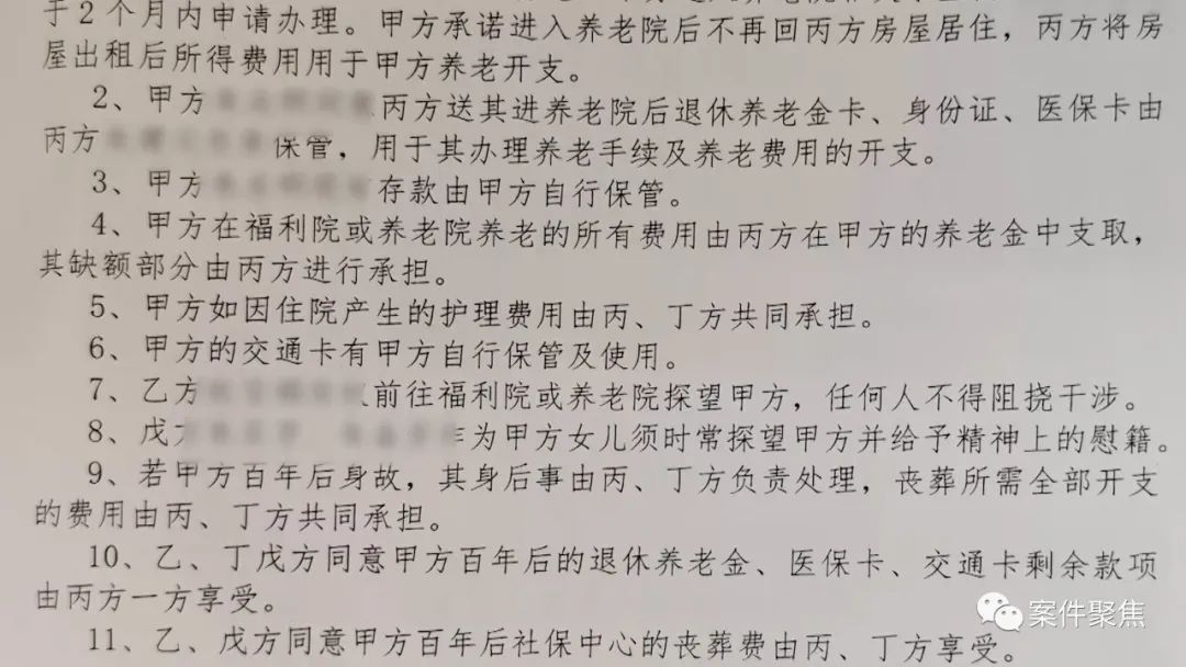 在多方沟通下,一份包含二十多项内容的调解协议出炉了,孙老伯一大家子人纷纷签字确认,调解会终于取得了圆满成功。散会后,孙老伯一家在调解员的陪同下来到淀山湖福利院,办理了入住手续。