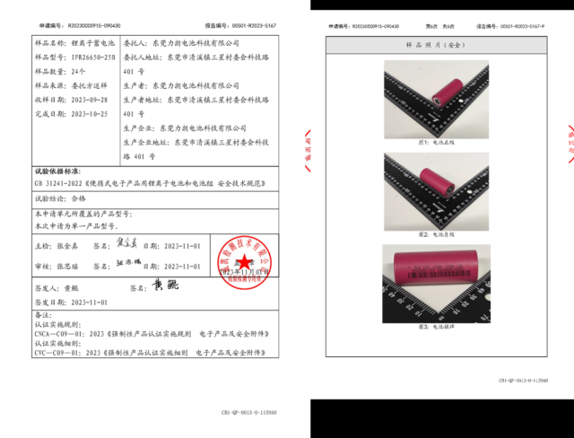 记者获悉,近日国家市场监督总局在全国认证认可信息公共服务平台陆续开始公布率先通过CCC认证的相关产品型号,其中,位于清溪镇的东莞力朗电池科技有限公司(下称“力朗电池”)26650电芯率先通过GB31241-2022标准多项严格测试并于顺利通过3C认证试验。