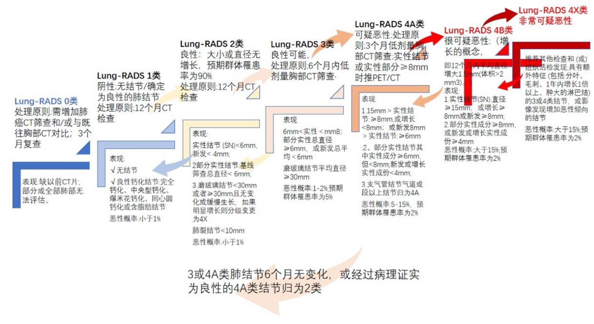 借鉴2022版的北美放射学会分级标准Lung-RADS分类用阶梯的形式给大家形象的讲解一下,随访是确定病灶升降级的主要方法。箭头方向是升降级的方向,追随观察无明显改变它也可以连降两级的呦。当然随着级别增高恶性可能性也在增加,最高级的我们影像强烈考虑恶性,稳妥的建议就切除做病理诊断。