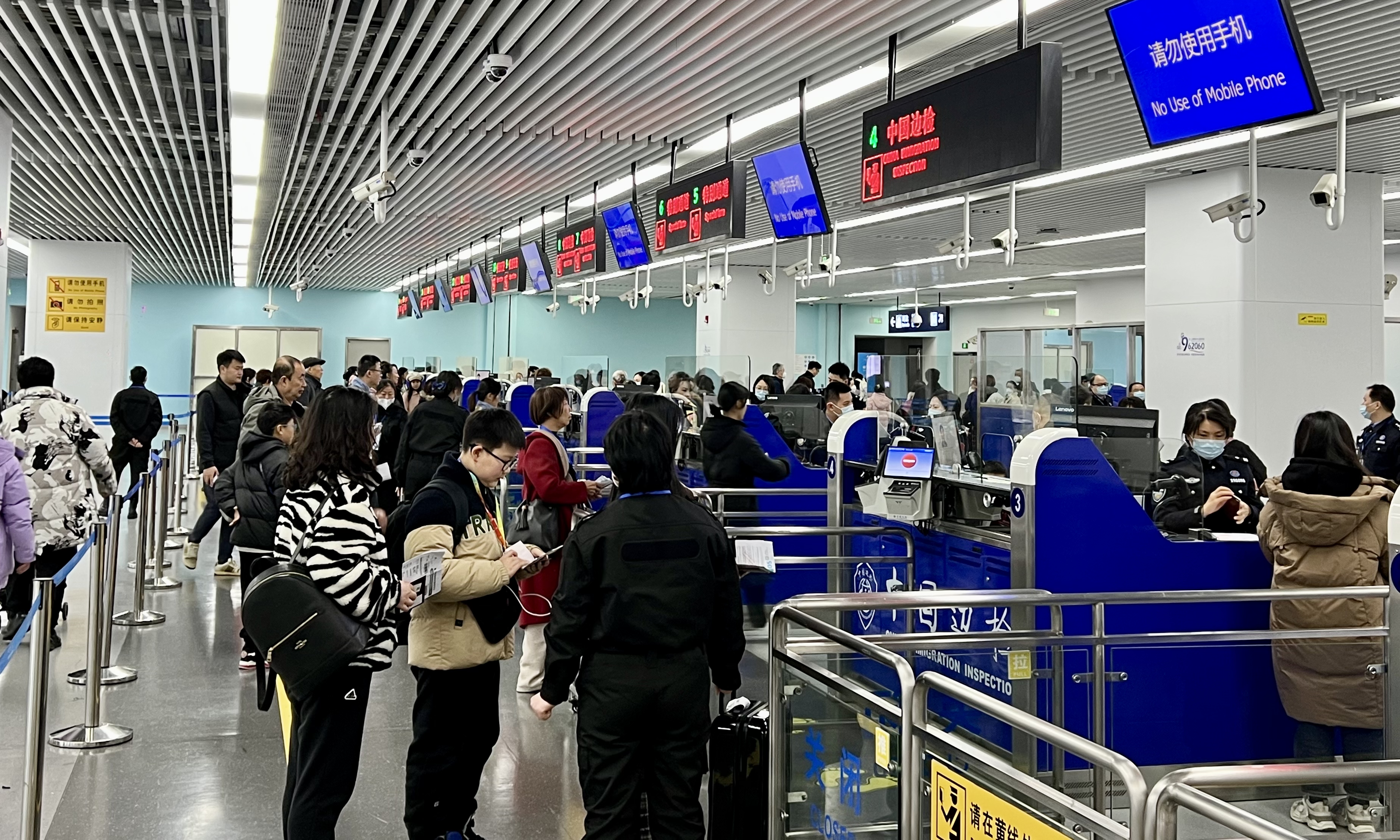 吴淞口国际邮轮港边检入境大厅里,旅客有序排队候检。黄波 摄