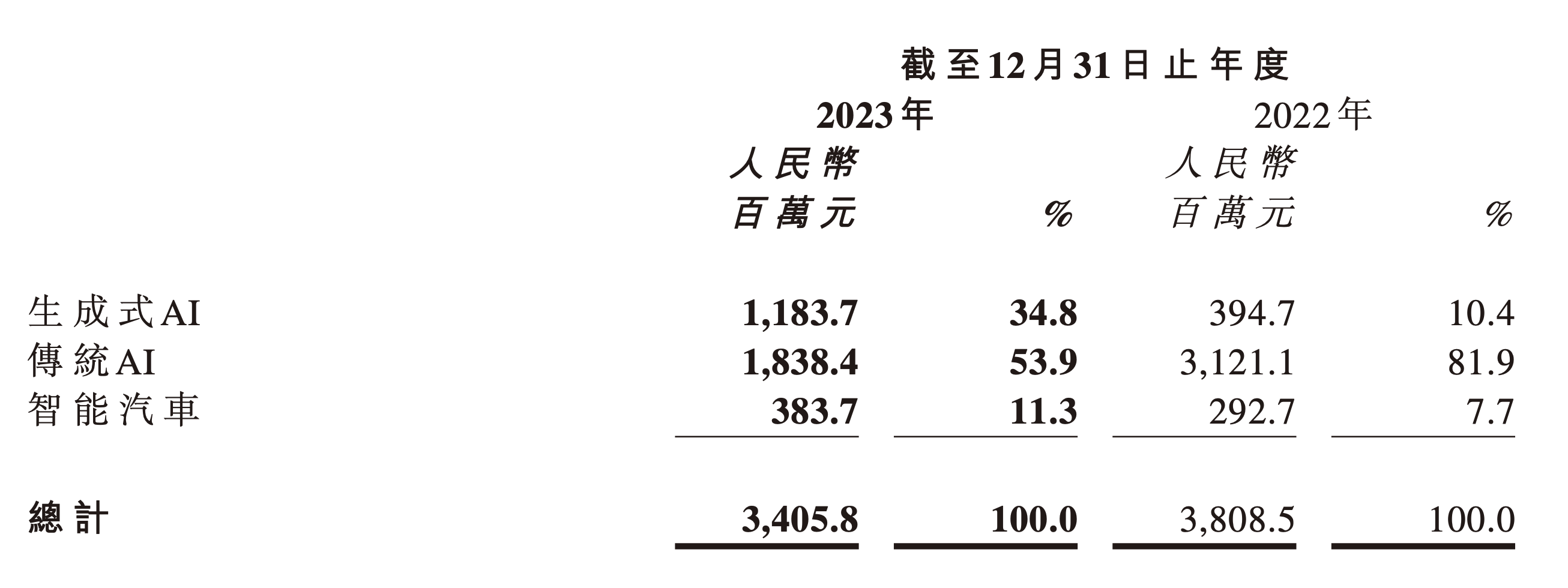传统AI业务方面(智慧城市、智慧商业与智慧生活中的非生成式AI业务),实现收入18.38亿元,同比减少41.1%,占总收入的53.9%,而2022年同期总收入为31.21亿元,占比高达81.9%。其中,智慧城市收入的占比降至10%以内。