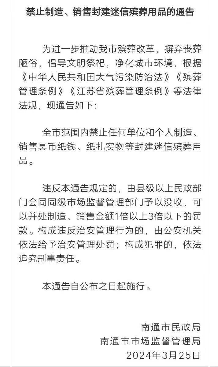 这份由南通市民政局、南通市市场监督管理局联合制作的通告发布于3月25日,通告的重点内容是南通将在全市范围内禁止任何单位和个人制造、销售冥币纸钱、纸扎实物等封建迷信殡葬用品,违反规定的,由县级以上民政部门会同同级市场监督管理部门予以没收,可以并处制造、销售金额1倍以上3倍以下的罚款。构成违反治安管理行为的,由公安机关依法给予治安管理处罚;构成犯罪的,依法追究刑事责任。