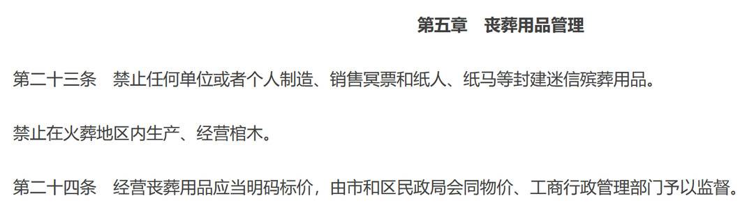 例如,《重庆市殡葬管理条例》第十六条规定:“禁止制造、销售阴币、冥币、纸扎等封建迷信殡葬用品。” 2018年大连市制定的《大连市殡葬管理条例》第四十六条规定:封建迷信殡葬用品,是指殡葬活动中使用的纸(绢)牛、纸(绢)马、纸(绢)人、纸钱、黄寿纸(黄裱纸)、冥纸、冥币、纸制金银锭以及各种仿制的房、车、家电、家具等。